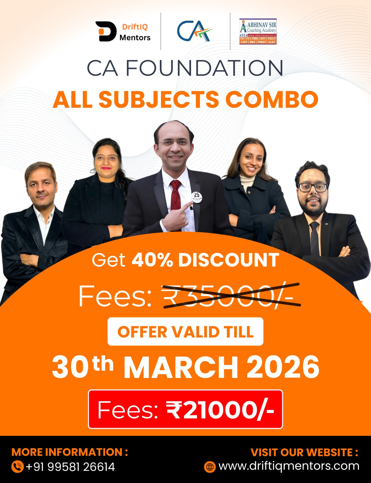 At DriftIQ Mentors, we are committed to shaping the future of aspiring Chartered Accountants by providing a strong academic foundation and practical understanding. Our CA Foundation Course is designed to simplify complex concepts, strengthen fundamentals, and build the confidence required to excel in exams.